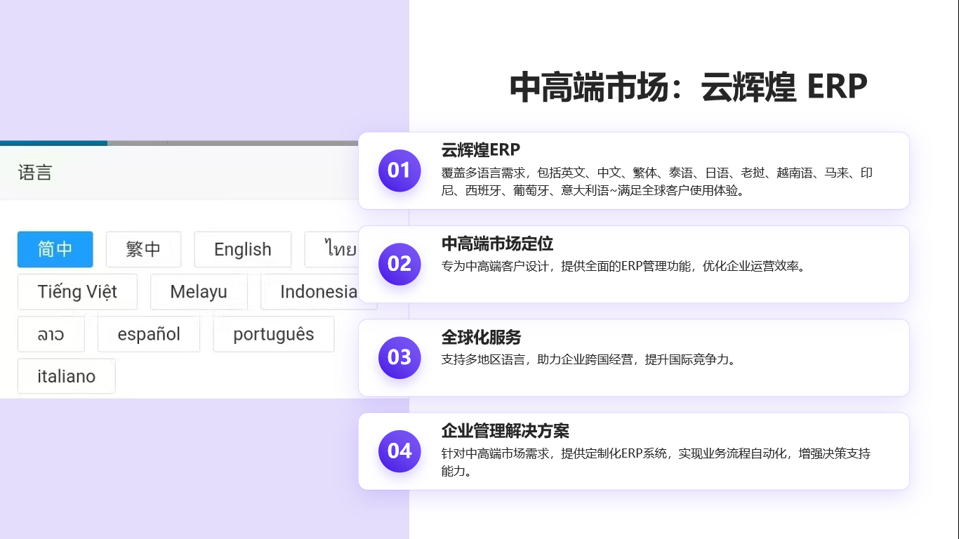 中高端市场:云辉煌ERP——多语言赋能全球协作