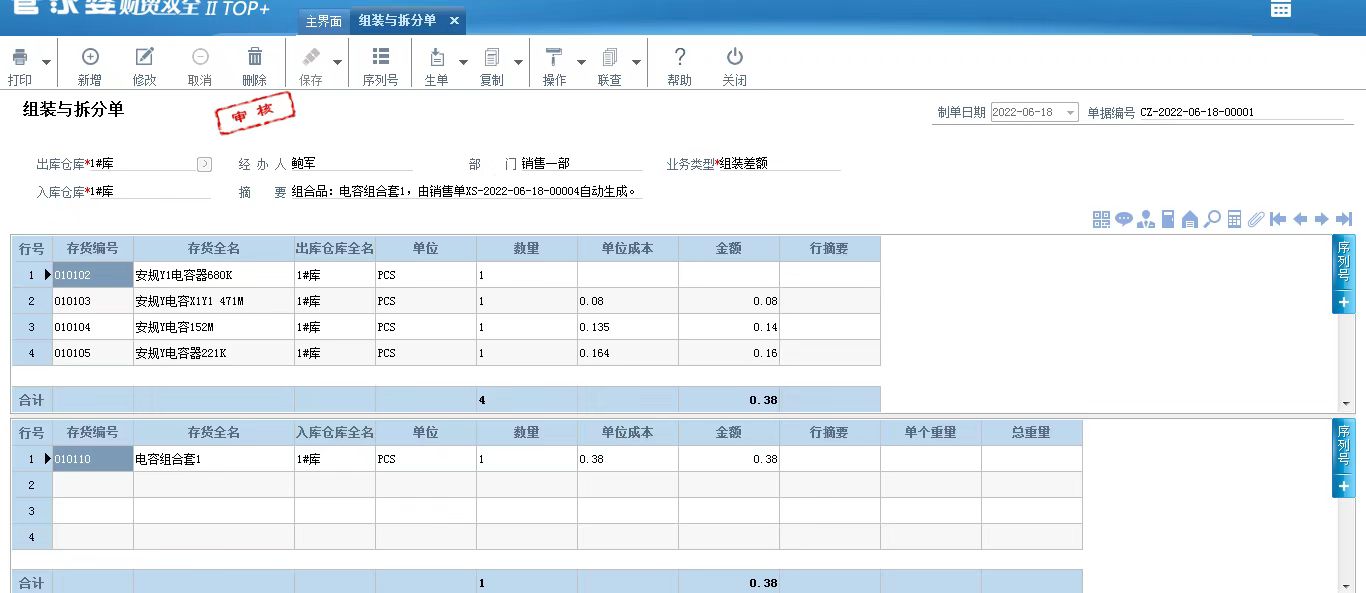 2.如果您有组装拆分业务处理需求,可以通过组装拆分费用分配单进行处理,在组装拆分过程中发生的其他费用,例如人工费用、制造费用等,为了准确计算入库存货的成本,需要将这些费用分配计入到入库存货的成本中