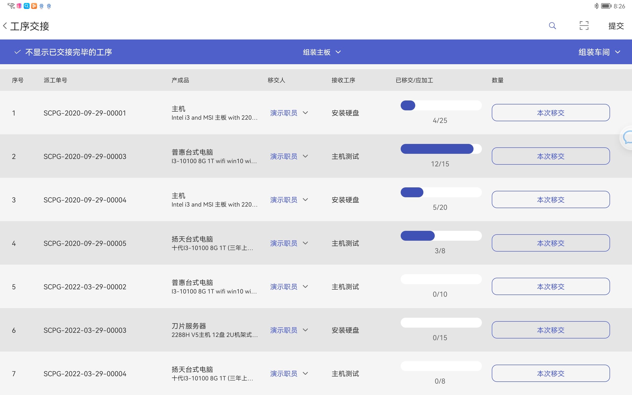 第三,在生产的时候完成第一道工序,移交到下一个工位的下一个工序继续加工,正常就是人员之间相互交接,要做交接记录,其实此记录在生产车间也可以完成,直接在车间的平板上面进行点击操作即可,这就叫做工序交接。