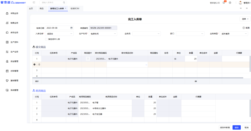 情况2:当企业无需管理生产过程,只管理库存时,则无需做生产任务单,直接手动做完工入库,选择产成品之后,对应耗用材料自动带入BOM材料并自动计算数量。