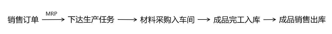 企业接到客户销售订单,根据销售订单下达生产任务,在原材料不够的情况下先进行原材料的采购,待材料入库之后,开始领料正式投产,整个生产环节完成后进行完工入库,最后销售发货。