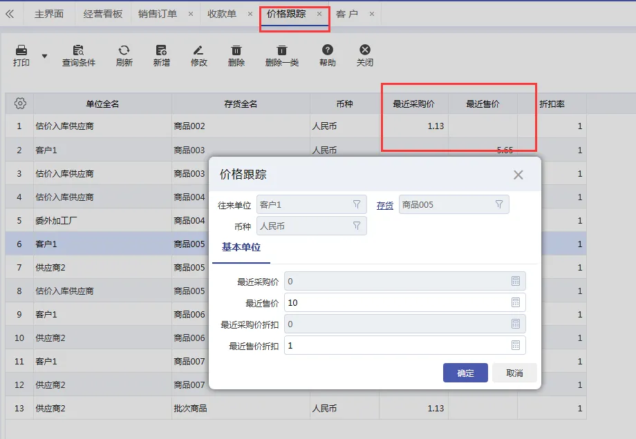4. 价格跟踪管理通过 系统设置-基础设置-价格跟踪 报表,查询并维护指定客户(或供应商)对应商品的最近采购价格或最近售价。