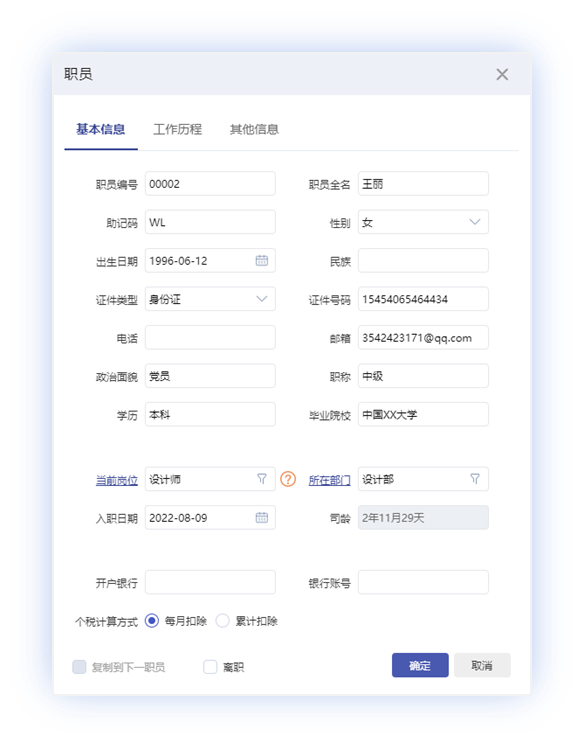 l 新增基本信息字段:如政治面貌、毕业院校、司龄等,丰富职员档案信息。