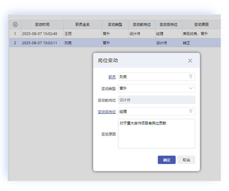 l 主要用于管理企业职员的岗位调动情况,用户可记录职员的晋升、调岗、降级及变动原因