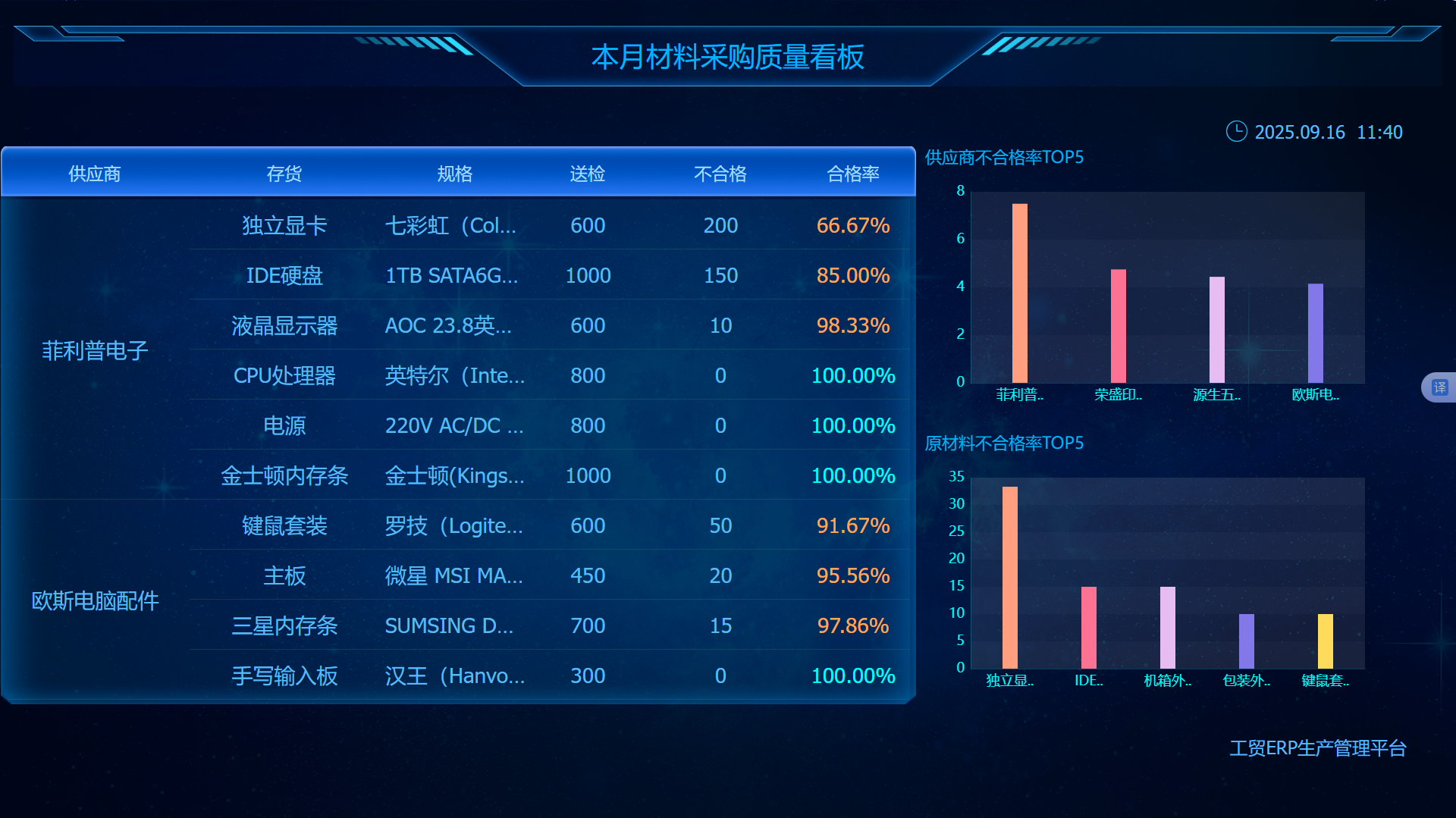 4.本月材料采购质量看板实时统计材料采购、委外完工过程中各检验项目的汇总数据,不合格原因统计,方便找出问题改善供应商质量水平;