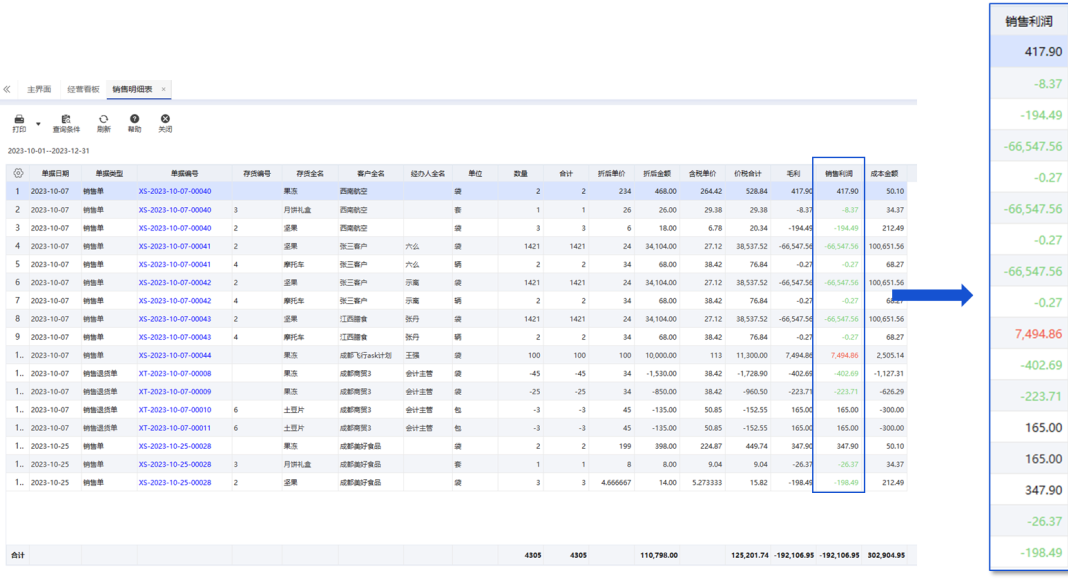 ⚫ 文字标注场景示例:销售明细表,销售利润大于等于1000的文字标注为【燃云火树】;销售利润小于等于100的文字标注为【一江春绿】
