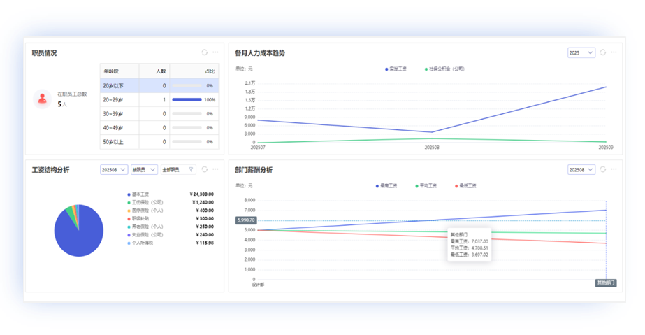 l 新增指标看板,含:职员情况、各月人力成本趋势、工资结构分析、部门薪酬分析